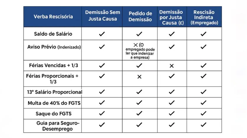 Para melhor entendimento, existem diversas tabelas que trazem as referidas verbas e guias devidas em cada modalidade de rescisão. As colunas indicam se a verba é devida (✔) ou não (✘) em cada cenário.